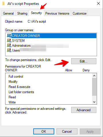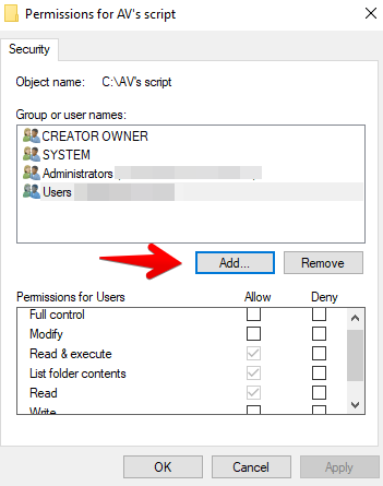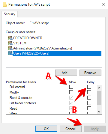- Now if the user is already on the security group you can select their user.If you want to allow permissions you can select allow (A) or if you want to deny the user permissions you can select Deny (B), afterwards click apply.