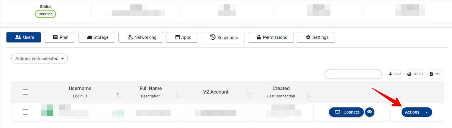 - Click on the cloud computer where the user connects to, or click on actions>manage computer