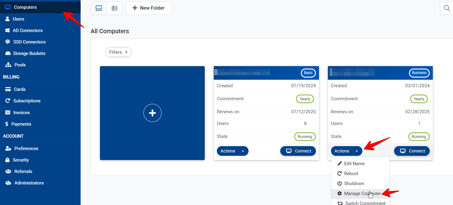 - Go to computers and select the computer you would like to upgrade, select actions and manage computer