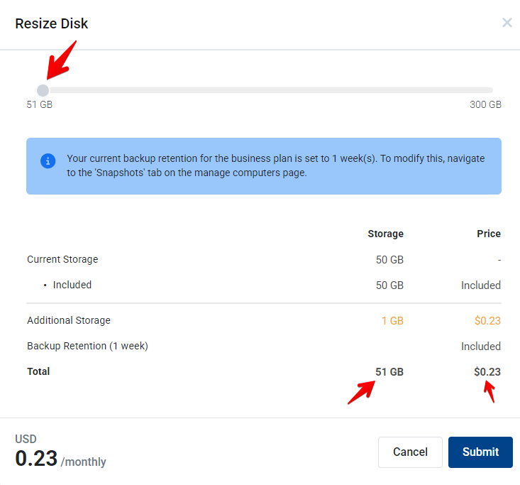 - Use the slider to increase storage to the required amount, you can see your total at the bottom right and the price.