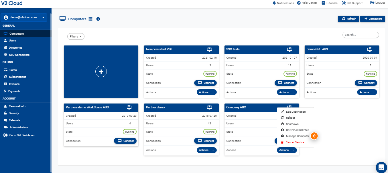 To forward a port to your Cloud Computer, click Actions — Manage computer from your Cloud dashboard.