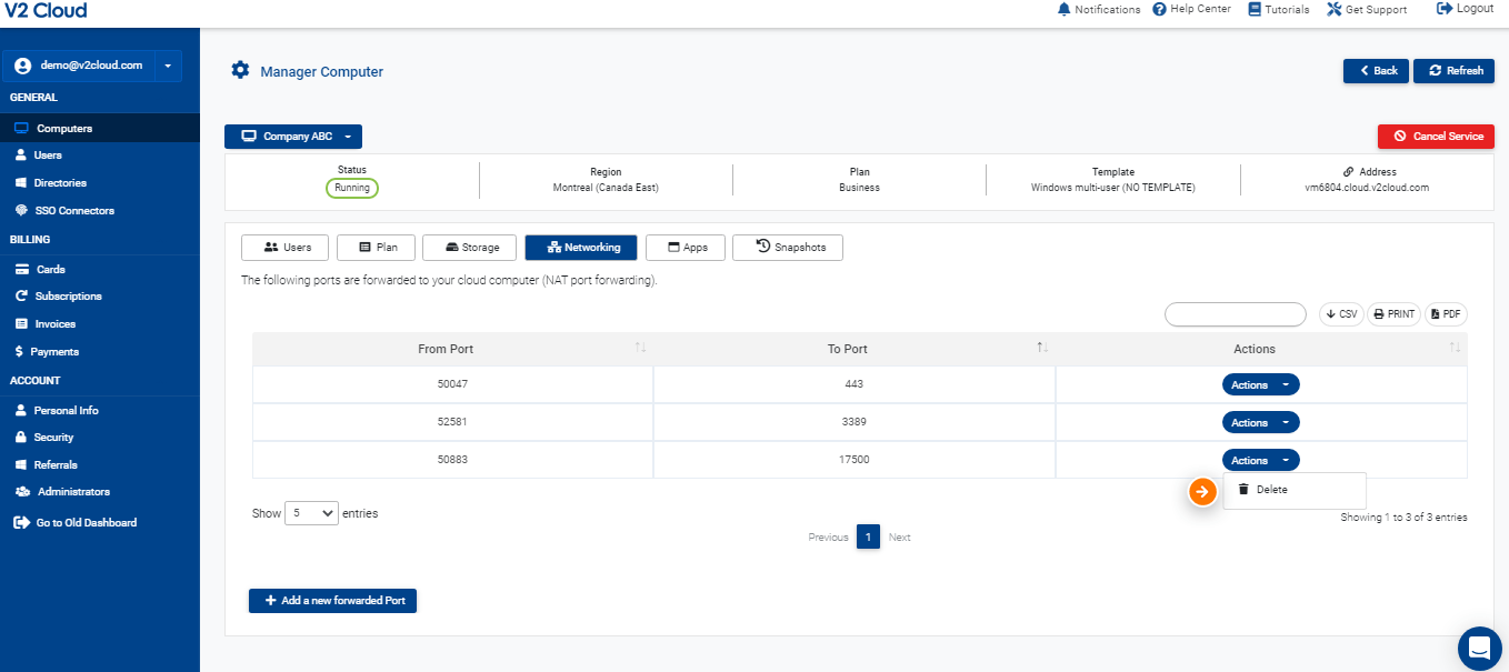 A random public port will be generated and forwarded to the Cloud Computer. You can remove the port forward by clicking Actions — Delete
