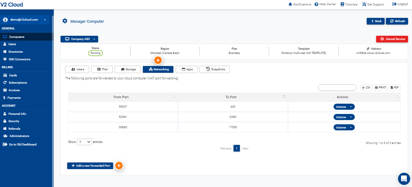 In this tutorial, you will learn how to forward a port from the V2 Cloud dashboard. This tutorial only applies to Cloud PC’s that were built with a Private IP address. If you built the computer with a Public IP address, all ports are open by default and port forwarding is not possible or required.