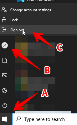 - To sign out correctly and not cause any issues when trying to connect again, please click on the windows icon bottom right (A), then click on the user icon (B) and then select sign out ( C)