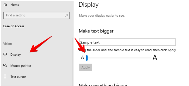 Increase desktop font size Go to settings then ease of access:Then go to display and select the font size:Please note that this will change the entire desktops font size.