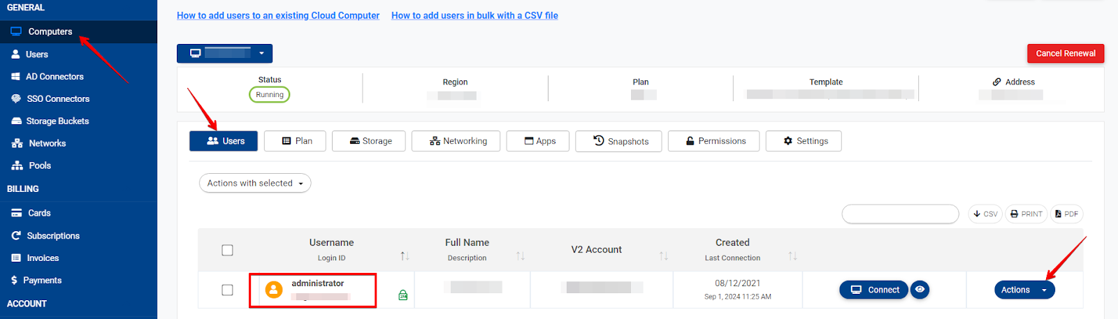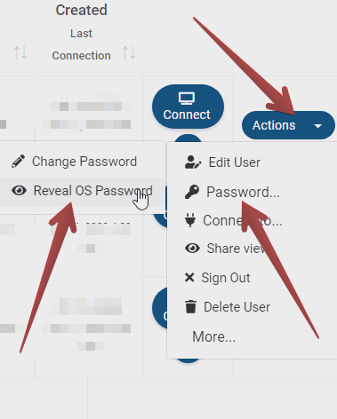 The Administrator and the user with administrator permissions on the Cloud computer can reveal the OS password from the Admin Dashboard by navigating to the Computers > Users tab and under the Administrator user click on Actions > Password field and then Click on "Reveal OS Password"
