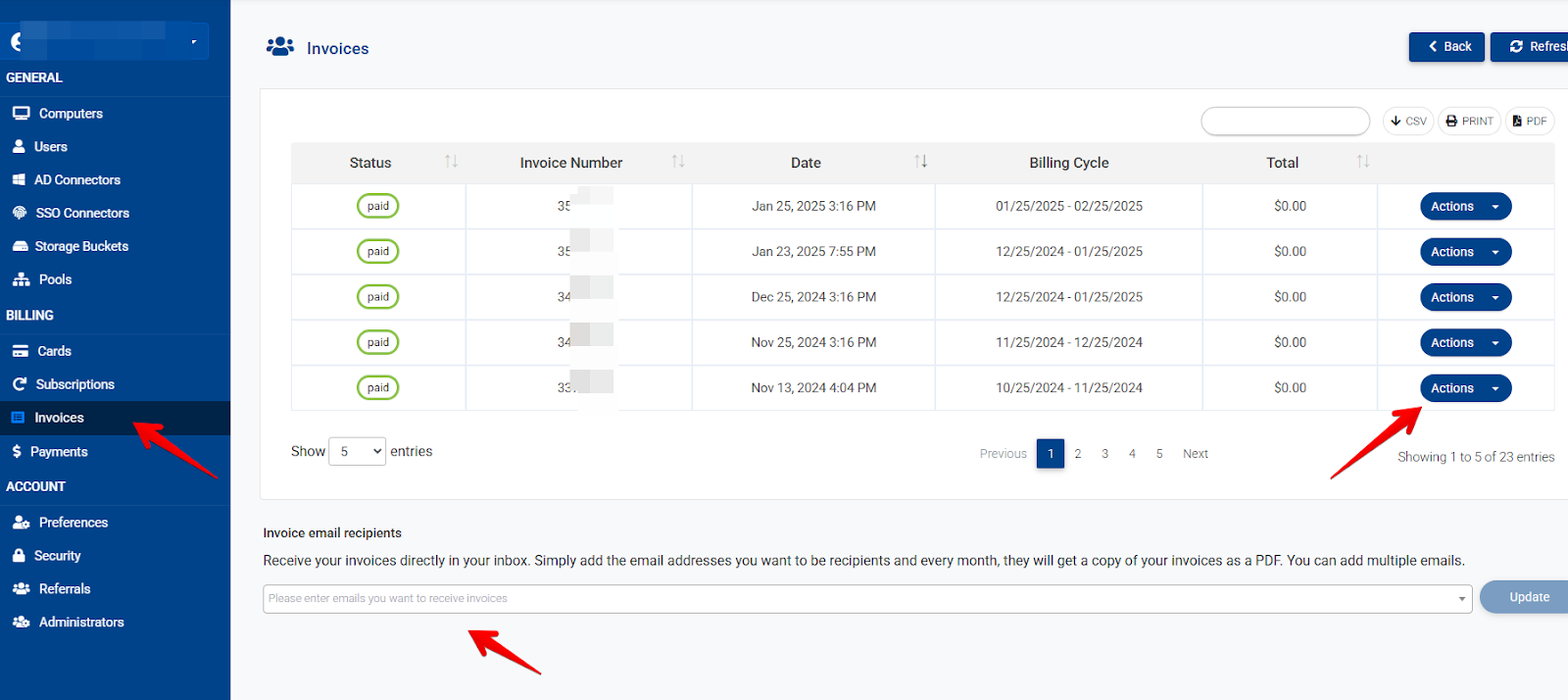 Here you can check the Invoice status, date, billing cycle, and total amount you pay monthly. Clicking on Actions will allow you to view the invoice breakdown to see in detail how you are paying for every item and download it.